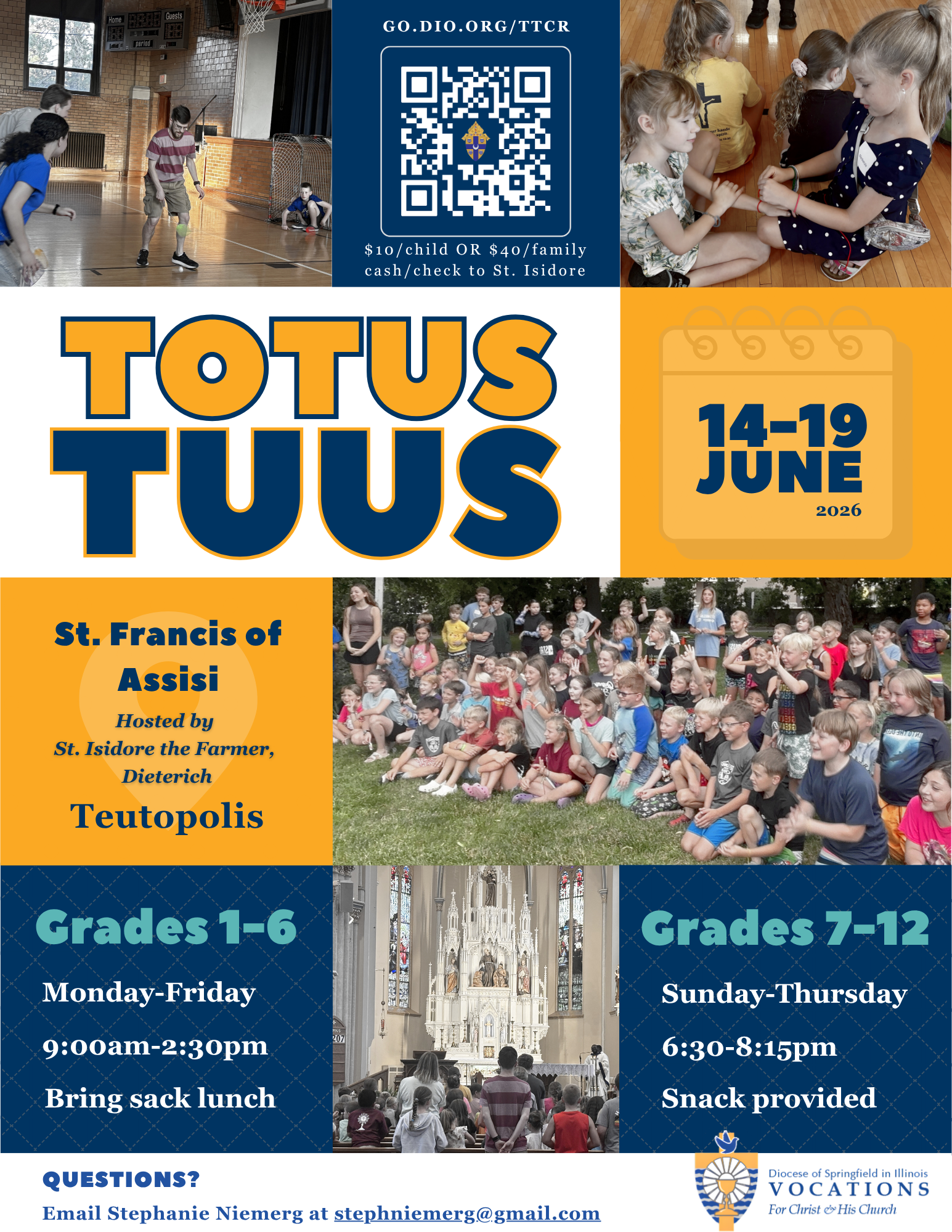 This year we will be hosting Totus Tuus at St Francis in Teutopolis. There are renovations at St Isidore this summer, St Francis is graciously letting us use the school and church. We are trying something new, please register with the QR code. To guarantee a place for your child, register early. We have a max capacity of 100 students for the day program. Please check in each morning between 8:30-9:00 a.m. in front of the Teutopolis Grade School gym. The Program for 1–6 graders runs from 9:00 a.m. to 2:30 p.m. Monday, June 15 through Friday, June 19. The teen program runs from 6:30-8:15 p.m. Sunday, June 14 – Thursday, June 18. Dinner is provided on Thursday night. Monday, Tuesday, Thursday & Friday there will be a Mass at 11:15 a.m. Parents, grandparents, parishioners and all visitors are welcome and encouraged to come! Wednesday Mass will be at 9:15am. Day of Prayer for Life all day. Monday – Thursday bring a sack lunch with your child’s name visibly on it. There is limited refrigerator space, you may want to include an ice pack. Friday cheese pizza and chips will be provided. Monday – Friday bring a water bottle with your child’s name on it. Snacks will be provided daily. Friday is Fun Day! There will be water fun at the end of the day! We ask that the children wear dark-colored t-shirts, shorts and tennis shoes; No swimsuits. Please remember that we will also be attending Mass that day. Please bring a towel with your name on it! We love your names on things:)